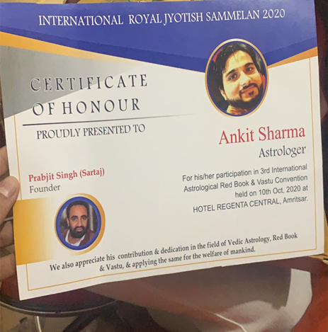 Astrology Red Book and Vastu Convention AwardImmensely appreciated and revered astrologer Pt. Ankit Sharma Ji has been ornated with the Certificate of Honour by the prestigious International Royal Jyotishi Sammelan 2020.